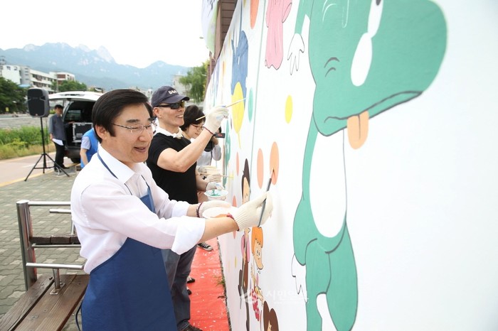 | ▲ 이동진 서울 도봉구청장이 우이천 옹벽을 '둘리 벽화'로 조성하는 작업에 참여해 붓을 들고 일손을 보태고 있다. 벽화에는 둘리의 탄생과정이 담겼으며 총 350m 길이다. | ||