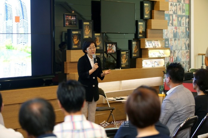 지난 22일 강남구 관광정보센터에서 열린 ‘구청장과의 행복한 현장데이트’에 참석한 신연희 구청장이 주민들과 함께 관광사업 진흥을 위한 다양한 의견에 대해 이야기를 하고 있다.(사진제공=강남구청)