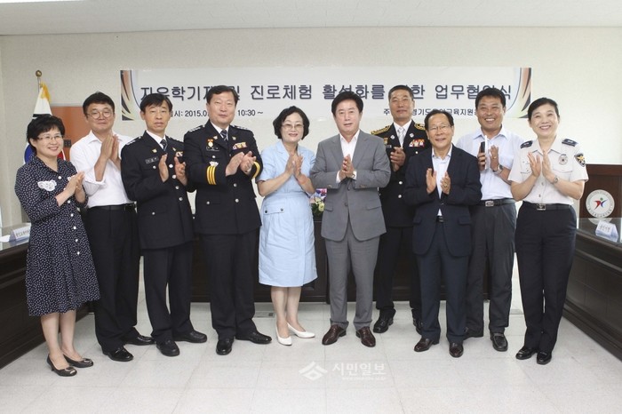 경기 용인시가 지난 22일 용인교육지원청에서 용인교육지원청, 서부경찰서, 용인소방서 등 4개 기관과 함께 '청소년 진로체험 업무협약'을 체결했다. 사진은 체결식에서 정찬민 시장(가운데 오른쪽)과 관계자들이 기념촬영한 모습.
