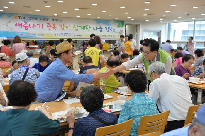 유덕열 서울 동대문구청장이 최근 동대문노인종합복지관에서 중복을 맞아 열린 ‘2015 여름나기 중복맞이 삼계탕 나눔행사’에 참석했다. 사진은 유 구청장이 배식 봉사 후 식사 중인 노인과 악수를 나누고 있는 모습.(사지제공=동대문구청)