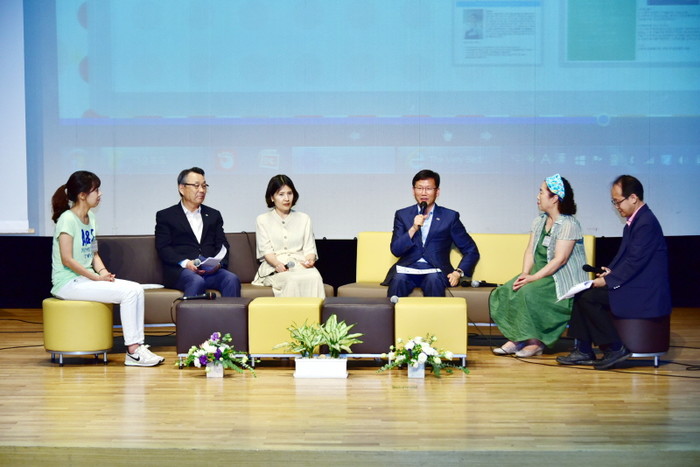 경기 김포시는 최근 시와 인문학 토크를 접목한 '2015년 평생학습 김포시민대학 수료식'을 진행했다. 사진은 무대에 올라 참여 학습자들과 시민대학과 평생학습에 대한 이야기를 진행 중인 유영록 시장(오른쪽 세 번째)의 모습.(사진제공=김포시청)