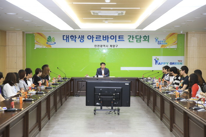 인천 계양구가 최근 하계 방학기간 동안 구청, 동 주민센터 및 사회복지시설 등에서 근무하고 있는 아르바이트 1기 참가 대학생 27명과 간담회를 개최했다. 사진은 간담회에서 박형우 구청장(중앙)과 참여 학생들이 이야기를 나누고 있는 모습.(사진제공=계양구청)