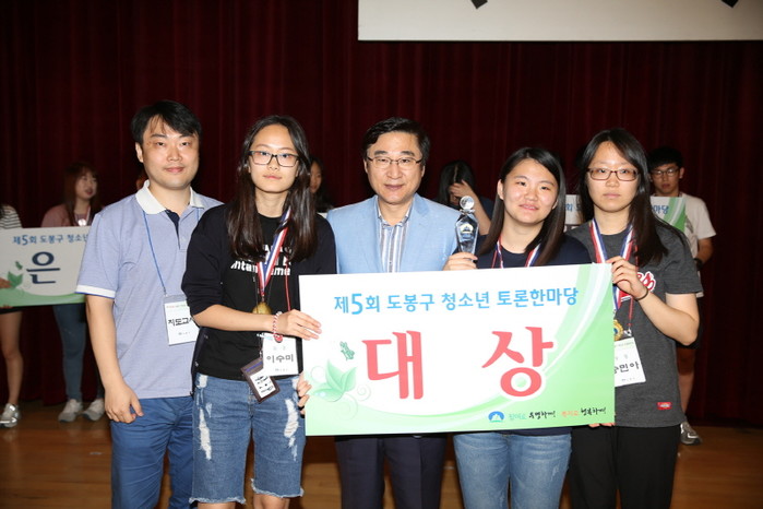 서울 도봉구가 청소년들의 사고력·논리력 향상을 위한 '제5회 도봉구 청소년 토론한마당' 행사를 최근 구청 대강당에서 개최한 가운데 이번 대회에서 대상을 거머쥔 정의여자고등학교 학생들이 이동진 도봉구청장(가운데)과 기념촬영을 하고 있다. (사진제공=도봉구청)