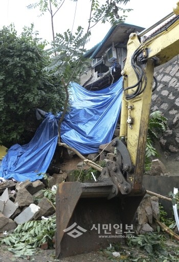 | ▲ 폭우… 주택가 축대 붕괴26일 오전 서울 종로구 부암동 주택가 축대가 무너져 인근 주민들이 대피했다.주택 건물을 받치고 있는 높이 6m, 가로 30m의 축대 중 8m 가량이 붕괴되면서 토사와 축대돌이 도로로 쏟아져 내렸다. 이 사고로 인명피해는 없었으며 경찰과 소방당국은 폭우로 인해 축대가 무너진 것으로 보고 정확한 사고 원인을 조사 중이다. /뉴시스 | ||