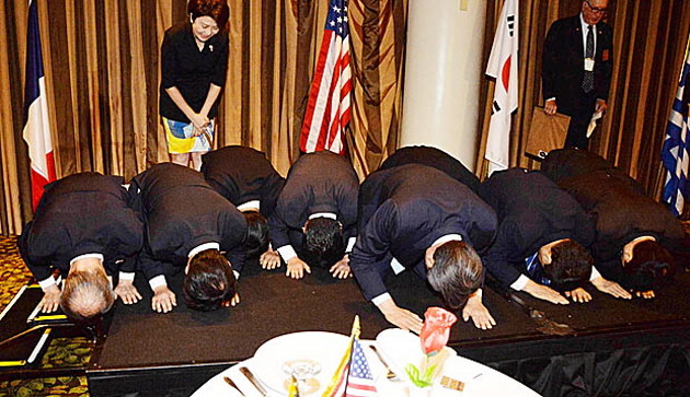 미국순방길에 나선 새누리당 김무성 대표와 수행의원들이 25일 저녁(현지시간) 미국 워싱턴 드블트리바이힐튼호텔에서 열린 한국전참전용사 리셉션에 참석, 참전용사들에게 큰절을 하고 있다.