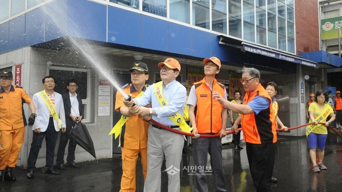 서울 광진구는 최근 중곡제일골목시장에서 '소방통로 확보를 위한 유관기관 합동훈련'을 실시했다. 사진은 김기동 구청장(중앙 왼쪽에서 두 번째)이 소방호스 사용 시범을 보이고 있는 모습.(사진제공=광진구청)