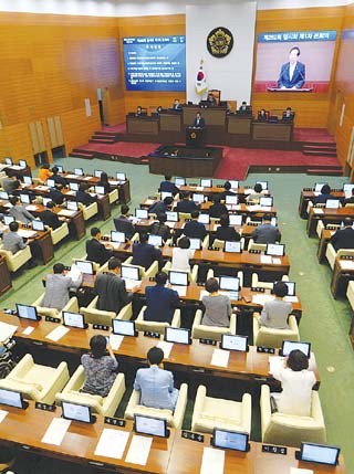 박원순 서울시장이 27일 오전 서울 중구 서울시의회 본회의장에서 열린 제262회 임시회 개회식에서 추가경정예산안 제출에 따른 시정연설을 하고 있다.