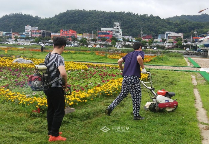 전남 장흥군4-H연합회는 오는 31일 막을 올리는 '제8회 정남진 장흥 물축제'의 성공적인 개최를 위해 최근 탐진강 축제동산 일대에서 환경정화활동을 실시했다. 사진은 이날 봉사활동에 참가한 4-H 회원들이 탐진강변에 조성된 꽃동산 주변의 제초작업과 쓰레기 수거에 구슬땀을 흘리고 있는 모습.(사진제공=장흥군청)
