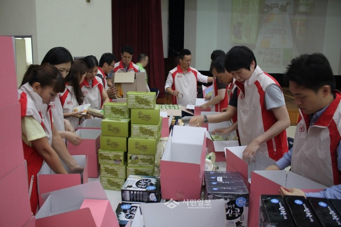 지난 27일 기아자동차 직원 자원봉사단과 지역복지관 봉사단이 서울 서초구의 저소득 결식아동에게 전달할 ‘영양바구니’를 만들기 위해 비타민제, 견과류, 두유 등을 바구니에 담아 포장하고 있다.(사진제공=서초구청)