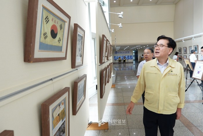 지난 27일 오후 서울 동대문구청 2층 아트갤러리에 마련된 '태극기 변천사 사진전시회'를 찾은 유덕열 구청장이 태극기 사진을 살펴보고 있다. 광복 70주년을 맞아 열린 이번 전시회는 오는 8월7일까지 운영된다.(사진제공=동대문구청)