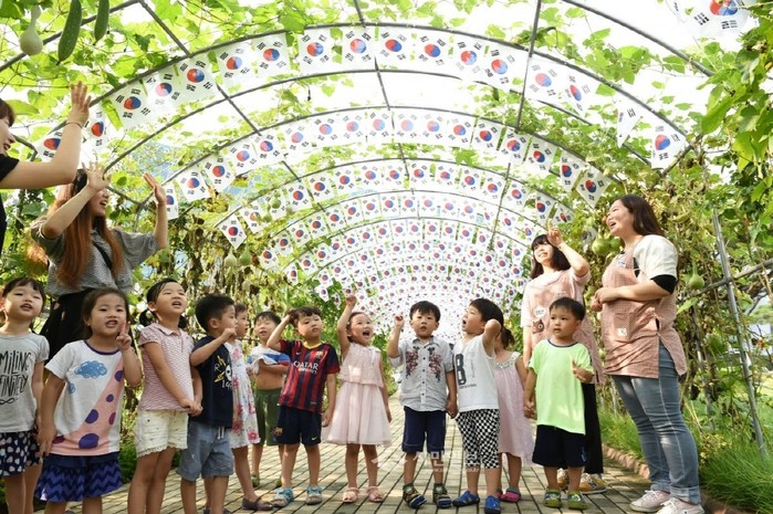 경기 광주시 시청에서 문화스포츠 센터 사이 통행로에 조롱박과 함께 태극기를 단 '태극기 터널'이 조성된 가운데 최근 이곳을 찾은 어린이들이 작은 태극기를 흔들며 기념촬영을 하고 있다. 시는 오는 8월15일까지 ‘광복70주년 태극기 사랑운동’을 집중 전개할 방침이다.(사진제공=광주시청)