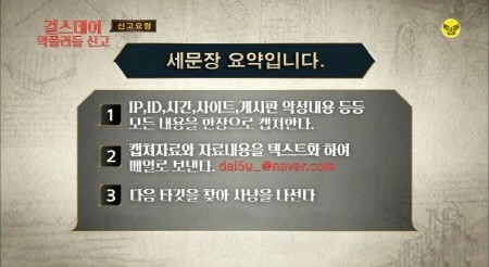 해당글 게시자는 공지를 통해 악플 신고요령과 함께 "자료는 일괄 정리돼 정확한 내용들만 소속사 담당자에게 전달돼 신고처리 된다"면서 "해외 거주시에도 고소시 한국에 있는 가족들에게 통보가 된다"고 밝혔다.