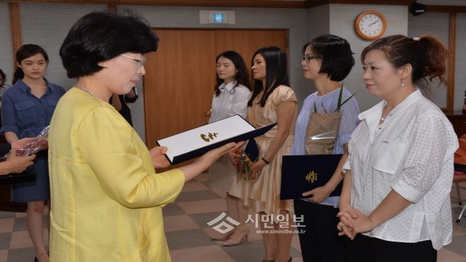 최근 서울 송파구청 대회의실에서 실시된 청년들의 창․취업 프로그램, 2015년 1기 ‘참살이실습터’ 교육생 수료식에 참석한 박춘희 구청장이 수료생들에게 수료장을 전달하고 있다. (사진제공=송파구청)