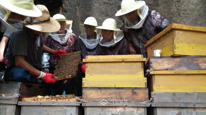 서울 노원구는 지난 28일 오전 10시 노원구 상계3·4동 불암허브공원내 양봉교육장에서 '2015년 도시양봉학교' 2기 수료식을 개최했다. 사진은 수료식에 앞서 수강생들이 벌통을 들여다보며 마지막 실습을 하고 있는 모습.(사진제공=노원구청)