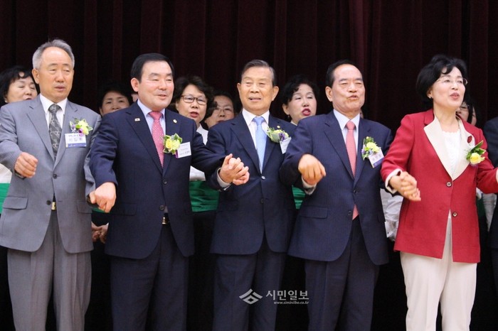 지난 28일 서울 송파구청 대강당에서 열린 ‘민주평화통일자문회의 송파구협의회 제17기 출범식’에 참석한 임춘대 의장(왼쪽 2번째)이 축사를 마치고 참가자들과 함께 손을 맞잡고 기념촬영을 하고 있다.(사진제공=송파구의회)
