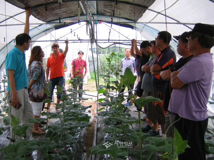 경기 양주시농업기술센터는 최근 애호박 재배기술 향상으로 고품질 농산물 생산을 위한 ‘애호박연구회 하계연찬교육’을 실시했다. 사진은 교육에 참가한 관계자들이 설명을 듣고 있는 모습.(사진제공=양주시청)