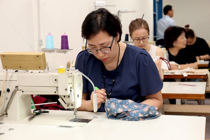 성동구 성동의류패션기술지원센터 교육 수료생들은 최근 경력단절 여성들의 재취업을 돕고자 '꿈맘봉제협동조합'을 발족했다. 사진은 봉제협동조합의 한 조합원이 한양여자대학교 봉제 공동작업장에서 가방을 만들고 있는 모습.(사진제공=성동구청)