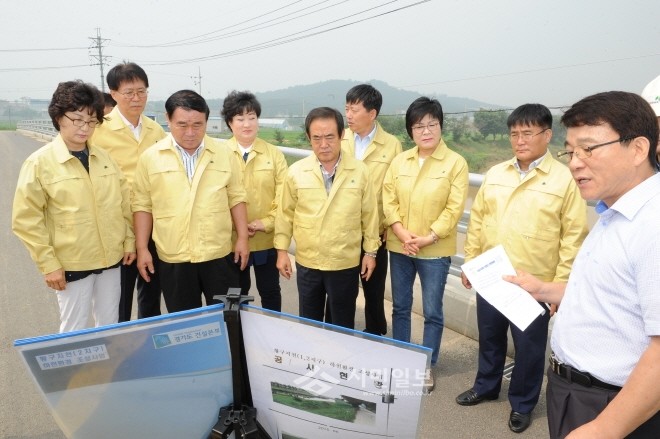 최근 경기 수원시의회 김진우 의장과 이재식 부의장을 비롯해 상임위원장인 유철수·박순영·한규흠·이혜련·김기정 위원장, 해당지역구 의원인 김정렬·양민숙 의원이 합동으로 재해예방사업 현장점검에 나섰다. 사진은 이날 현장점검에 나선 김 의장(가운데)과 의원들이 현장 관계자에게 공사 진행사항을 보고받는 모습.(사진제공=수원시의회)