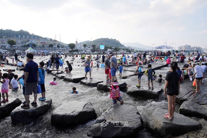 연일 찜통더위가 이어지고 있는 가운데, 지난 1일 정남진 장흥물축제를 찾은 인파들이 탐진강에서 무더위를 식히고 있다. 지상 최대의 물싸움, 맨손 물고기 잡기, 수상 자전거 등 시원한 체험 프로그램으로 무장한 정남진 장흥물축제는 탐진강과 우드랜드 일원에서 오는 6일까지 계속된다.(사진제공=장흥시청)