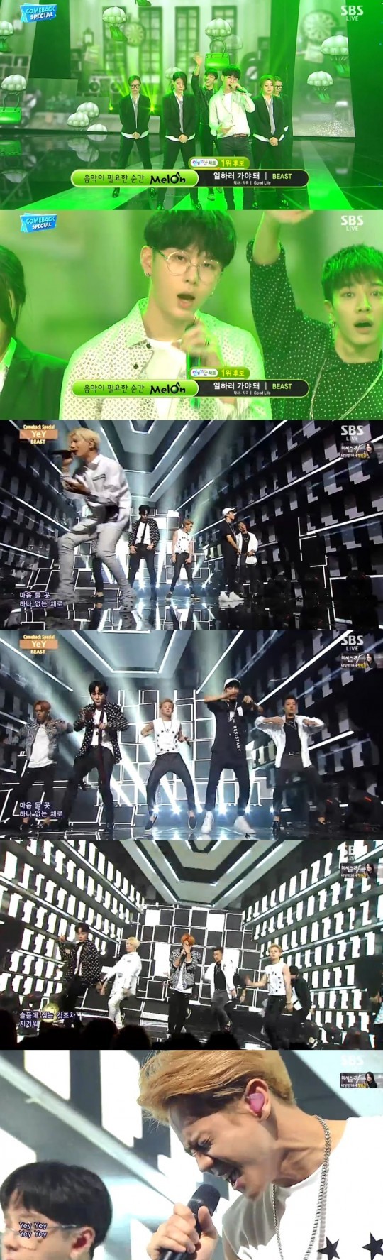 비스트는 2일 오후 서울 등촌동 SBS 공개홀에서 생방송으로 진행된 SBS '인기가요'에서 에이핑크 소녀시대를 제치고 1위 트로피를 거머쥐었다.
