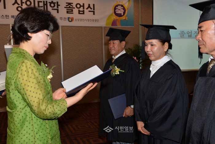 최근 송파구 이스턴베니비스에서 풍납동시장 상인 50여명을 대상으로 실시한 ‘풍납동풍납시장 제2기 상인대학 졸업식’에서 박춘희 구청장(왼쪽)이 프로그램 이수증을 상인들에게 전달하고 있다.(사진제공=송파구청)