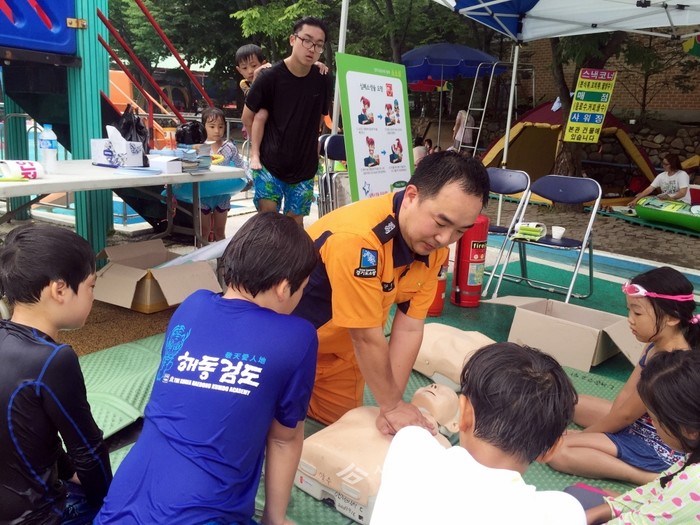 경기 양주소방서는 3일 여름철 피서객들의 안전문화 정착을 위해 장흥 신흥유원지에서 소소심 체험장을 운영했다. 사진은 이날 유원지를 찾은 어린이들이 한 소방대원의 심폐소생술 교육을 지켜보고 있는 모습.(사진제공=양주소방서)