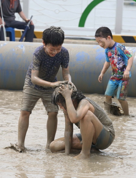 지난 2일 경기 화성시 전곡항과 궁평항 일원에서 펼쳐진 '2015 화성해양페스티벌'을 찾은 어린이들이 갯벌 생테체험장에서 머드를 바르며 놀고 있다.(사진제공=화성시청)