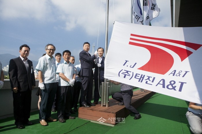 경북 구미시는 2015년 8월의 기업으로 (주)태진A&T를 선정하고 3일 오전 9시 시청 국기게양대 앞에서 박의식 구미시 부시장(오른쪽)과 (주)태진A&T 관계자 등이 참석한 가운데 사기(社旗) 게양식을 열었다.(사진제공=구미시청)