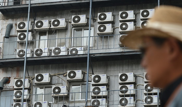 전국적으로 무더위가 기승을 부리는 가운데 3일 오후 한 시민이 서울 중구 에어컨 실외기들이 설치된 건물 앞을 지나가고 있다. 한국소비자원은 2012년부터 2014년까지 에어컨 화재사고의 주 원인을 분석한 결과 에어컨 실외기가 화재의 주범이라 밝혔다.