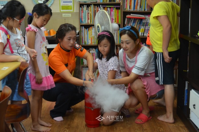 서울 강북소방서가 지난 3일 수유동 옹달샘지역아동센터에서 초등학교 1~5학년 학생 10여명을 대상으로 소방안전교육 및 화재대피 체험을 실시했다. 사진은 이날 교육에 참여한 학생들이 소방대원의 지도에 따라 소화기 사용 체험을 하고 있는 모습.(사진제공=강북소방서)