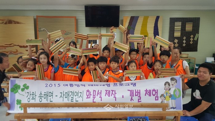 서울 은평구 신사2동 주민자치위원회에서는 최근 자치회관 여름방학 특별프로그램의 일환으로 초등학생 및 학부모들과 함께 자매결연지인 강화도 송해면 일원에서 화문석 만들기 및 갯벌체험 행사를 열었다. 사진은 행사에 참여한 학생들이 만든 화문석을 들고 기념사진을 찍은 모습.(사진제공=은평구청)