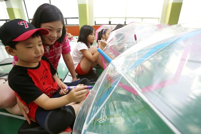 지난 3일 송파구 마천동에 위치한 어린이안전교육관에서 장마철 어린이들의 안전한 보행을 돕기 위해 열린 '투명우산 만들기 교실'에 참가한 어린이들이 직접 만든 투명우산에 그림을 그리고 있다.(사진제공=송파구청)