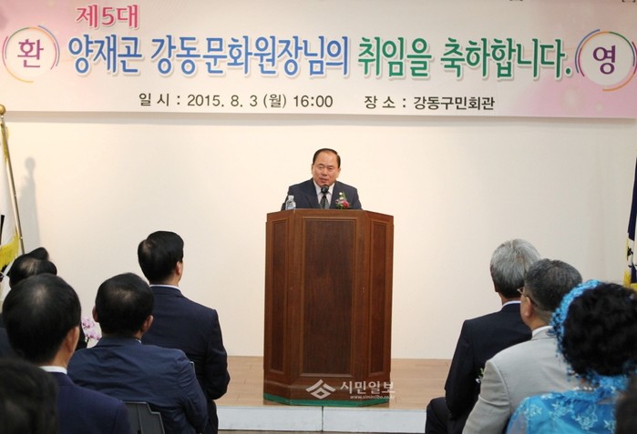 지난 3일 서울 강동구민회관에서 실시된 ‘제5대 강동문화원장 취임식’에 참석한 김용철 부의장(가운데)이 양재곤 강동문화원장의 취임을 축하하는 축사를 하고 있다.(사진제공=강동구의회)
