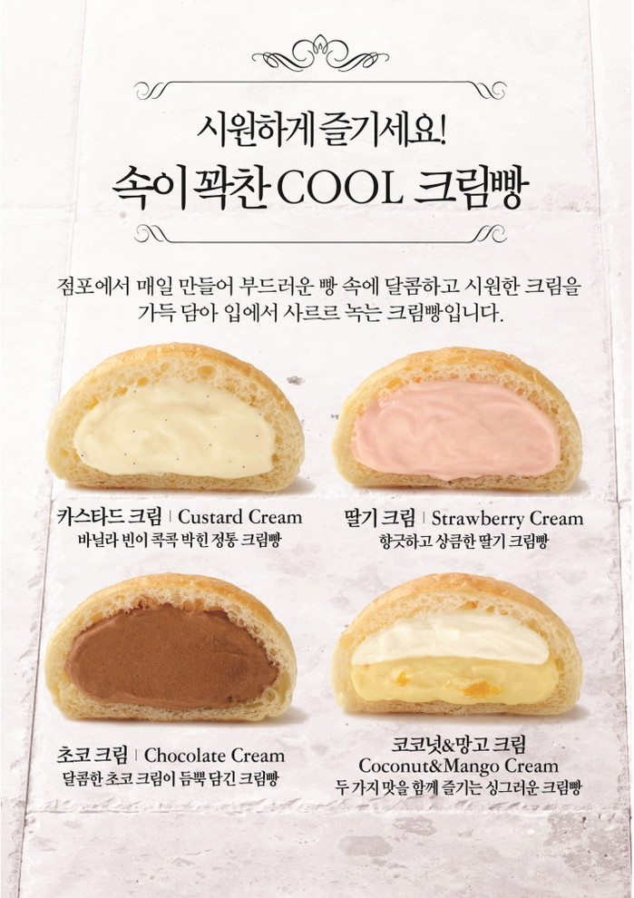 ‘쿨 크림빵’ 5종은 냉장고에 보관해 차갑게 먹는 여름 시즌 한정 제품으로 부드러운 빵 속에 달콤하고 시원한 크림을 가득 담은 것이 특징이다. 카스타드크림, 초코크림, 딸기크림, 코코넛&망고크림, 단팥&슈크림 등 총 5종의 다양한 크림을 사용해 선택의 폭을 넓혔다.