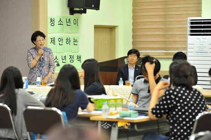 인천 부평구 부평어울림센터에서 최근 '2015년 청소년 참여예산학교'가 열린 가운데 홍미영 부평구청장(왼쪽)이 참여 청소년들과 함께 청소년 정책에 관한 토론을 진행하고 있다.(사진제공=부평구청)