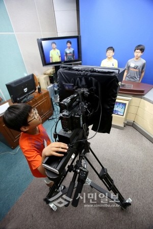 지난 4일 여름방학을 맞아 송파구가 마련한 '어린이 방송아카데미'에 참가한 아이들이 구청 인터넷 방송국에서 카메라 장비를 이용한 뉴스제작 체험을 하고 있다.(사진제공=송파구청)