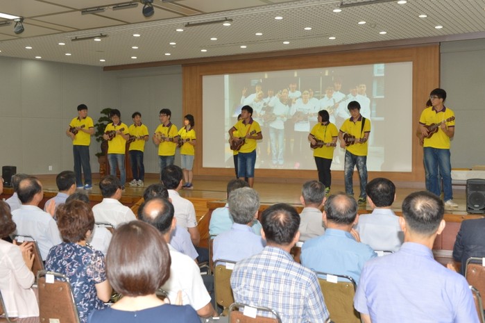 최근 경기 동두천시청 대회의실에서 열린 '8월 월례조회 식전행사'에 참가한 '장애인보호작업장 우쿨렐레 공연단'이 공직자들을 대상으로 우쿨렐레 연주를 선보이고 있다.(사진제공=동구천시청)