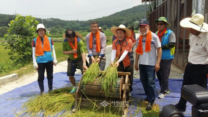 경기 여주시 능서면에서는 최근 구양리일원에서 올해 전국에서 처음으로 '노지 벼베기 행사'를 실시했다. 사진은 행사에 참여한 관계자들이 '옛날식 탈곡체험'을 하면서 즐거워하는 모습.(사진제공=여주시청)