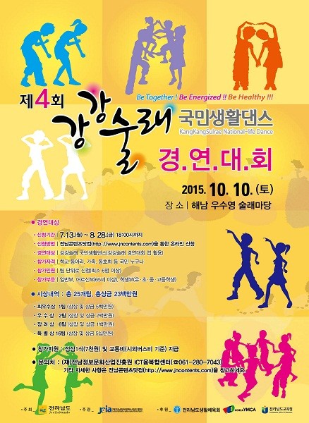 올해로 4회를 맞는‘강강술래 국민생활 댄스 경연대회’는 전라남도와 전남정보문화산업진흥원이 주관하고 전남생활체육회, 한국YMCA전국연맹, 전남교육청이 후원, 오는 10월 10일 명량대첩축제 기간에 해남에서 개최된다.