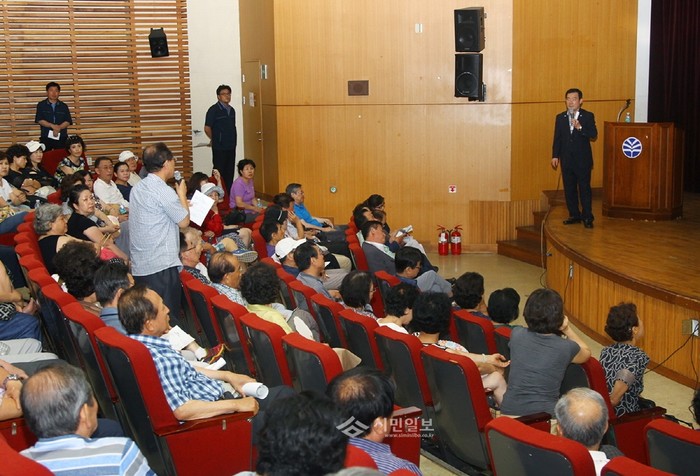 임춘대 서울 송파구의장이 최근 SH공사 주관으로 열린 '올림픽훼밀리타운 도로소음 차단시설 설치 주민설명회'에 참석해 주민의견을 청취하고 있다. 임 의장은 이 자리에서 주민의견이 반영될 수 있도록 SH공사, 서울시, 송파구에 의견을 전달하는 등 최선을 다하겠다고 밝혔다. (사진제공=송파구의회)