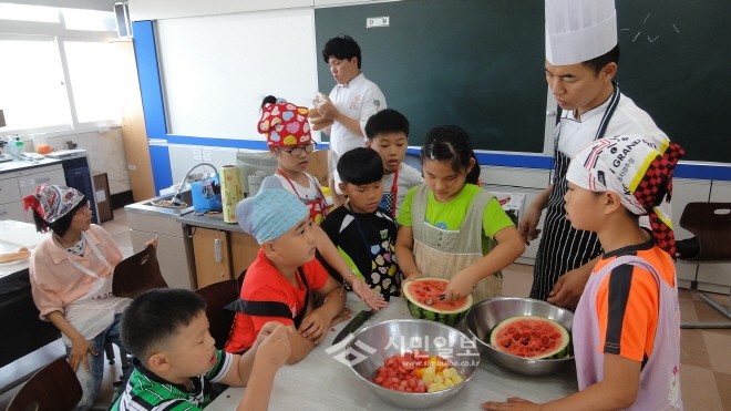 전남 광양시 다압초등학교가 최근 여름방학을 맞은 학생들을 대상으로 요리·컴퓨터·논술·통기타 등의 교육을 실시하는 '다압캠프'를 운영했다. 사진은 캠프에 참여한 학생들이 강사의 지도에 따라 화채를 만들고 있는 모습.(사진제공=전라남도교육청)