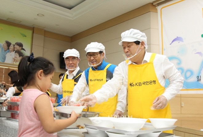 이성 서울 구로구청장(오른쪽)이 최근 구청 강당에서 열린 '(주)KB금융그룹과 함께하는 시원한 여름나기 봉사활동' 행사에 참석해 지역내 저소득 아동들에게 짜장면을 배식하고 있다. 이번 행사에서는 마술쇼, 풍선아트 등 다양한 공연도 함께 열렸다. (사진제공=구로구청)