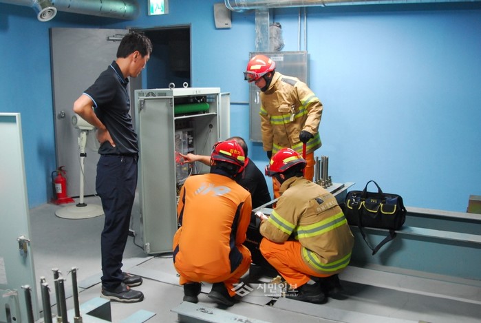 경기 하남소방서는 지난 10일 오전 유니온파크 전망대에서 대규모 정전에 대비한 119구조대원 '승강기 구조훈련'을 실시했다. 사진은 훈련에 참여한 구조대원들이 건물 관계자로부터 승강기 작동원리에 대한 설명을 듣고 있는 모습.(사진제공=하남소방서)