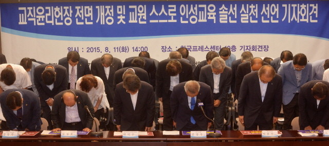 한국교원단체총연합회(한국교총)를 비롯한 교육계 대표와 공교육살리기학부모연합 등 교육시민단체 대표들이 11일 오후 서울 중구 프레스센터에서 '교직윤리헌장 전면 개정 및 교원 스스로 인성교육 솔선 실천 선언' 기자회견에서 최근 일련의 학교 내 성범죄에 대해 고개숙여 대국민 사과를 하고 있다.