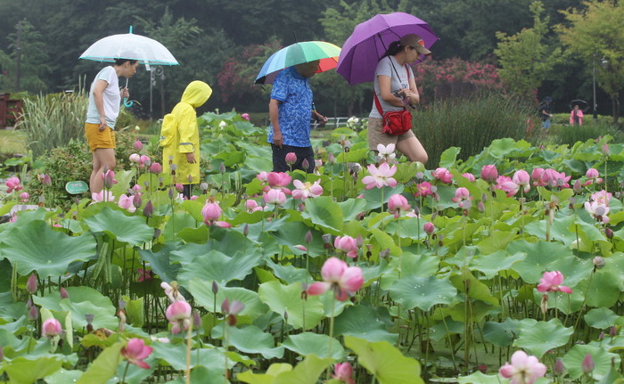 말복인 12일 무더위를 식히는 비가 내리는 가운데 경남 함양군 함양읍 상림연꽃단지를 찾은 관광객이 우산을 들고 활짝 핀 연꽃을 감상하고 있다./뉴시스