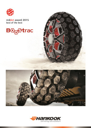 이번 최우수상을 수상한 미래형 컨셉 타이어 ‘부스트랙’은 혁신적인 미래형 타이어를 발굴하는 한국타이어의 ‘디자인 이노베이션 2014’ 프로젝트를 통해 독일 포츠하임 대학과 공동 연구로 탄생했다. 특히 ‘부스트랙’은 지구 온난화로 인한 사막과 같은 지형에서 탁월한 성능을 발휘하도록 가변형 트레드 블록 구조를 통해 최상의 트랙션 성능과 입체적 접지력을 구현하도록 디자인돼, 타이어의 무한한 가능성과 능력을 표현한 점이 특징이다.