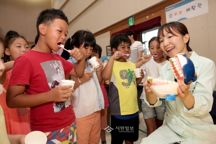 서울 성동구는 지난 11일 오후 2시 구청 3층 대강당에서 어린이 건강생활실천을 위한 '2015 성동 꿈나무 건강 축제'를 개최한 가운데 이날 축제에 참여한 어린이들이 치아 모형을 보며 양치질하는 방법을 배우고 있다.(사진제공=성동구청)