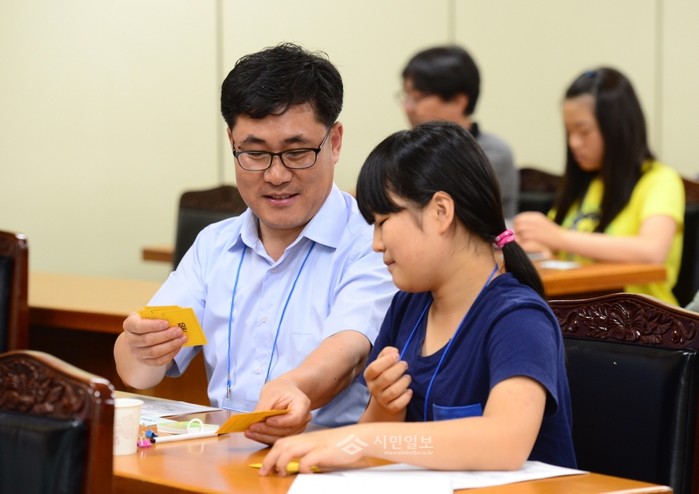 인천시교육청이 지난 11일 여름방학을 맞아 초등학교 6학년생 및 학부모, 중학교 1학년 학생들을 대상으로 '학습동기향상 캠프'를 진행했다. 사진은 교육에 참여한 학생과 학부모가 낱말카드를 가지고 교육을 진행 중인 모습.(사진제공=인천시교육청)