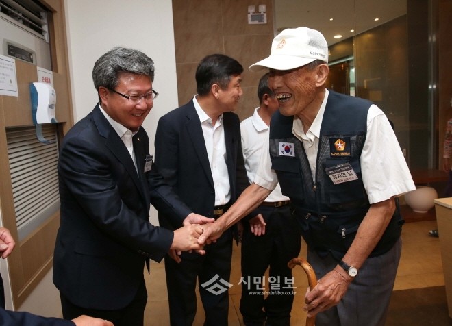 경기 화성시는 12일 화성문화원 주관으로 제암리 순국 유적지에서 '독립유공자 후손 및 강제동원 피해자와 함께하는 광복 70주년 행사'를 열었다. 행사에 참석한 채인석 시장(왼쪽)이 강제동원피해자 류지면옹(오른쪽)과 인사를 나누고 있는 모습.(사진제공=화성시청)