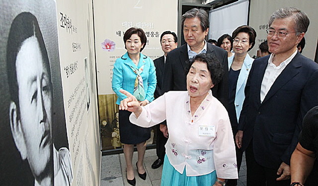 12일 서울 종로구 대한민국역사박물관에서 ‘독립을 향한 여성영웅들의 행진’ 전시회가 열린 가운데 오희옥 지사와 김무성 새누리당 대표, 문재인 새정치민주연합 대표, 김희정 여성가족부 장관과 애국지사 후손들이 전시회를 둘러보고 있다.
